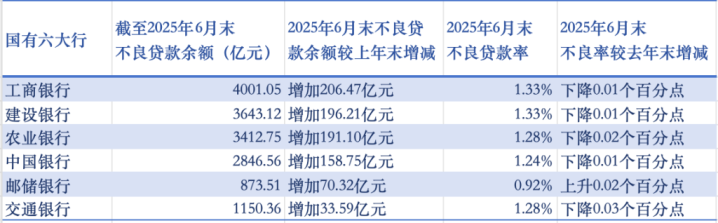 资产质量方面,延续2024年的走势,国有六大行的不良贷款余额今年上半年集体走高,除邮储银行外,其余5家大行不良贷款率小幅回落。
